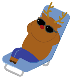 サングラスをかけて、ビーチでくつろぐトナカイのイラスト