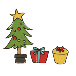 クリスマスツリーの前に置かれた沢山のプレゼントのイラスト