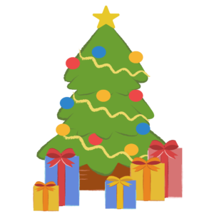 クリスマスツリーの前に置かれた沢山のプレゼントのイラスト